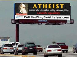 Un type que PZ Myers considère comme « en état de mort cérébrale » s'est lancé vaillamment dans la mêlée. Ray Comfort, le Ben Stein du télévangélisme, a payé 6000 $ pour louer pendant un mois un panneau publicitaire le long de l'autoroute 105, dans le Sud de la Californie. C'est sans doute une coïncidence, mais Comfort a annoncé la parution prochaine de son livre au titre accrocheur, You Can Lead an Atheist to Evidence but You Can't Make Him Think (On peut présenter des preuves à l'athée, mais on ne peut le forcer à réfléchir).