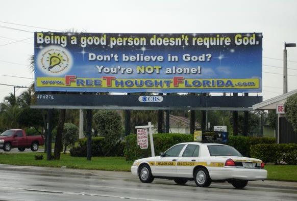 À Fort Lauderdale, en Floride, une société affiliée des American Atheists (AA), Florida Atheists and Secular Humanists (FLASH), a fait afficher le message ci-dessous. Les résidents du coin, principalement des Afro-Américains, ont cherché à le faire retirer. FLASH espère pouvoir montrer son message ailleurs dans le sud de l'État. Selon le journal New Observer,