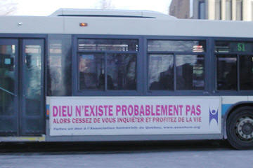 Série de campagnes publicitaires en faveur de l'athéisme dont la première a été lancée en Angleterre par l'auteure comique londonienne Ariane Sherine. La première annonce disait: « There's probably no god. Now stop worrying and enjoy your life » (Dieu n'existe probablement pas, alors cessez de vous en faire et profitez de la vie). Les fonds nécessaires à la campagne ont été réunis par la British Humanist Association, et le scientifique Richard Dawkins s'est engagé à doubler les dons jusqu'à la somme de 5 500 livres. Les premières annonces ont été placardées sur quelque 600 autobus et dans de nombreuses stations du métro de Londres le 21 octobre 2008.* Un chauffeur d'autobus a refusé de faire son travail en raison de l'affiche.