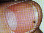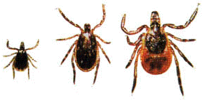 | Ixodes scapularis est le porteur le plus commun de la tique dans la partie nord-est et centrale ouest des États-Unis. La photo ci-haut (de g. à d.) montre la nymphe, le mâle adulte et la femelle adulte. Le point noir sur le pouce montre la grosseur relative de la nymphe. | Spirochètes le Lyme (Borrelia burgdorferi) |