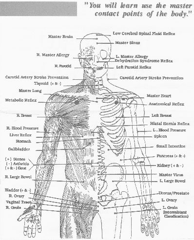 La recherche a prouvé que le corps humain est comme un ordinateur, fait d'un cerveau (générateur électrique et réservoir de mémoire) et des milliers de miles de fils électriques appelés les nerfs. Ces nerfs mettent en communication tous les organes, glandes et tissus. Ces nerfs aussi sont en communication avec des "fusibles" ou "disjoncteurs" appelés des réflexes de contact. En contactant ces réflexes, utilisant le système musculaire comme un indicateur, nous sommes capables de contrôler la fonction des systèmes de l'organisme.