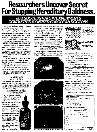 Cette annonce a paru dans le numéro d'août 1980 de Body Forum, publié par A. Glenn Braswell. Elle était une de plusieurs qu'il a utilisé pour commercialiser des comprimés de vitamines et des lotions comme remèdes pour la calvitie durant la fin des années 1970 et au début des années 1980. Braswell a probablement établit un record comme la personne contre qui le Postal Service a intenté le plus grand nombre de poursuites reliées aux soins de santé suite à des plaintes de fausse représentation. Comme un représentant du Postal Service l'a résumé lors d'une enquête Congressionnelle en 1984: