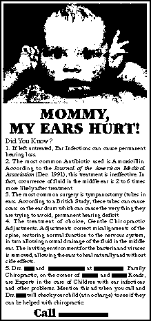 En avril 1993, cette annonce paru dans un journal local en Pennsylvanie. L'article du journal mentionné dans l'item #2 n'était pas au sujet d'otites infectieuses, mais plutôt d'otite séreuse, une collection de liquide dans l'oreille moyenne. L'annonce est dangereuse parce que les otites infectieuses qui doivent être traitées avec des antibiotiques peuvent s'étendre aux os tout près ou au cerveau. Aucune étude publiée n'existe qui a démontré que la manipulation de la colonne vertébrale est efficace comme traitement des otites. Ni y-a-t'il raison de croire qu'un chiropracticien est qualifié pour examiner les oreilles des enfants pour préciser s'il y a infection et quel type de traitement est indiqué.